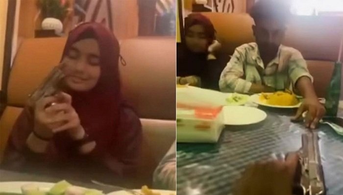 গাজীপুরের শ্রীপুরে একটি রেস্তোরাঁয় পিস্তল হাতে নিয়ে তরুণ-তরুণীর খুনসুটির দৃশ্য সামাজিক যোগাযোগমাধ্যমে ছড়িয়ে পড়েছে। ভাইরাল হওয়া ভিডিওতে দেখা যায়, খাবার টেবিলের পাশে বসে থাকা এক তরুণী ও এক তরুণ পরস্পরের দিকে পিস্তল তাক করে খেলাচ্ছলে আচরণ করছেন।