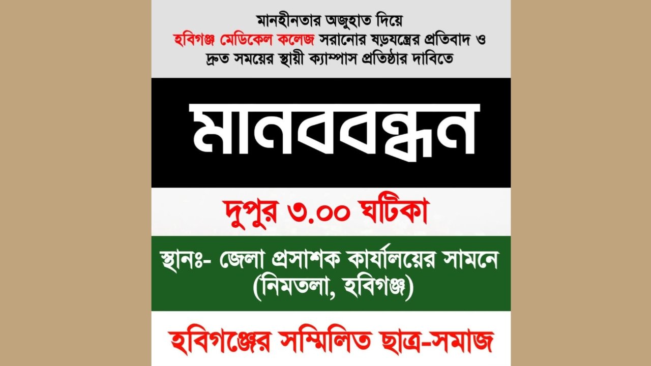 বৃহস্পতিবার দুপুর ৩টায় জেলা প্রশাসকের কার্যালয়ের সামনে (নিমতলা, হবিগঞ্জ) এই মানববন্ধন অনুষ্ঠিত হবে। আয়োজকরা দাবি করছেন, হবিগঞ্জ মেডিকেল কলেজকে অন্যত্র সরিয়ে নেওয়ার পরিকল্পনা মানা হবে না এবং দ্রুত সময়ের মধ্যে স্থায়ী ক্যাম্পাস প্রতিষ্ঠার উদ্যোগ নিতে হবে।